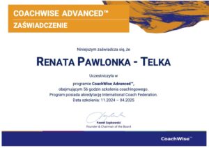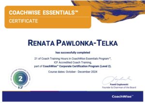 Renata: Ukończyłam program Advanced z akredytacją ICF w wyspecjalizowanym centrum szkoleniowym CoachWise i obecnie jestem w trakcie procesowania certyfikacji ACC w ICF.