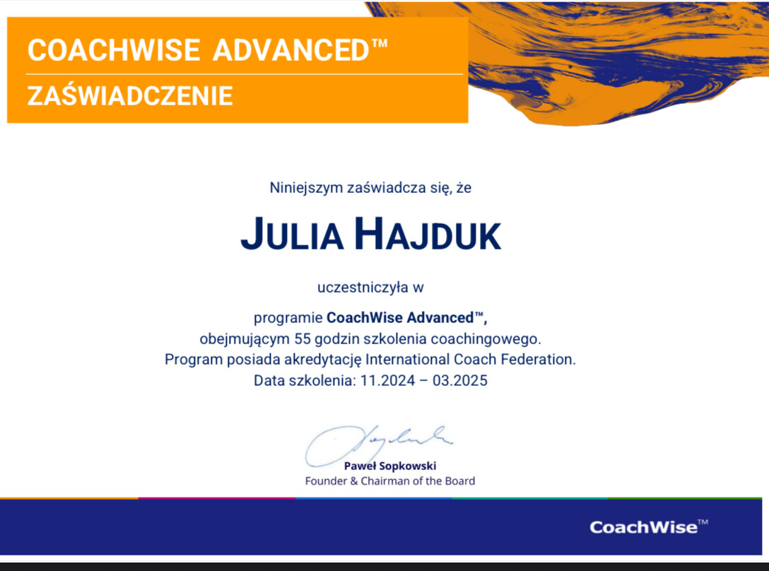 Nazywam się Julia i jestem life i business coachem, w trakcie międzynarodowej akredytacji coachingowej ACC ICF (International Coaching Federation). Ukończyłam studia magisterskie na kierunku Zarządzanie ze specjalnością Psychologia biznesu i coaching. W swojej pracy kieruję się Kodeksem Etycznym ICF.