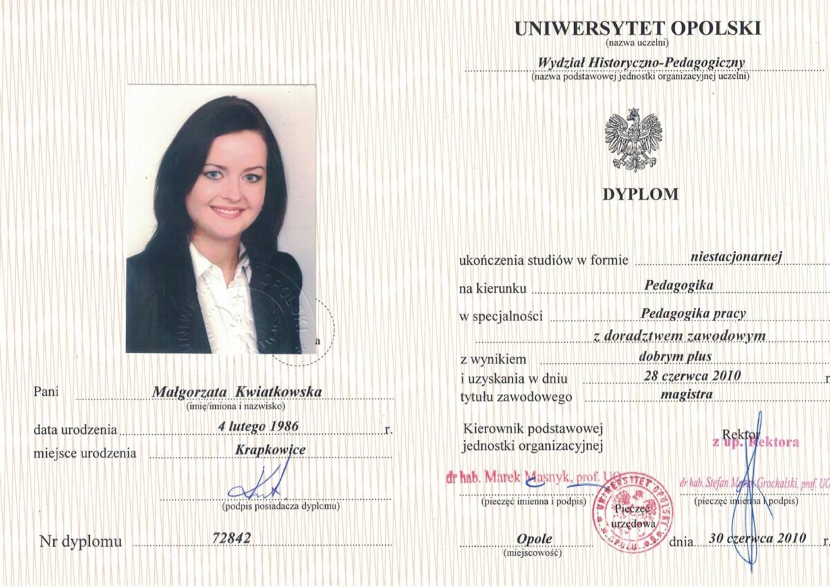 Magister z Pedagogiki Pracy z Doradztwem Zawodowym, uzyskane na Uniwersytecie Opolskim.