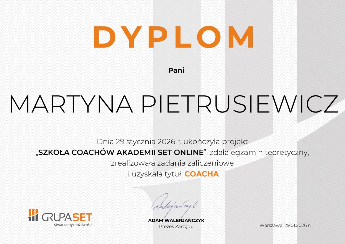 Z pełnym przekonaniem polecam współpracę z Martyną każdej osobie, która czuje, że utknęła w miejscu i szuka skutecznego wsparcia w rozwoju zawodowym jak i osobistym. Martyna to coachka o wyjątkowej uważności i empatii. Potrafi nie tylko słuchać, ale też naprawdę usłyszeć – wychwytuje z rozmowy to, co najistotniejsze, i zadaje trafne, pogłębiające pytania, które otwierają zupełnie nowe perspektywy. Od pierwszego spotkania czułam się w tej relacji bezpiecznie. Martyna tworzy przestrzeń pełną szacunku, zrozumienia i akceptacji, w której można być sobą i mówić szczerze o swoich trudnościach. To osoba, której można zaufać – zarówno w kontekście procesu, jak i wrażliwych tematów, które się pojawiają. Kiedy zaczynałam współpracę z Martyną, miałam poczucie przytłoczenia i bezsilności wobec wielu spraw. Problemy wydawały się zbyt duże, a cele – nierealne. Dzięki naszym regularnym spotkaniom nauczyłam się lepiej radzić sobie ze stresem, odpuszczać to, co zbędne, i nie bać się trudnych tematów, tylko je krok po kroku rozwiązywać. Martyna zapoznała mnie z konkretnymi metodami i technikami, które realnie wspierają mnie w codziennych wyzwaniach. Razem wypracowałyśmy podejścia, które nie tylko sprawdzają się na co dzień, ale też pozwoliły mi ruszyć z miejsca – zarówno w sferze zawodowej, jak i osobistej. To dla mnie ogromnie wartościowa i transformująca współpraca. Dziękuję!