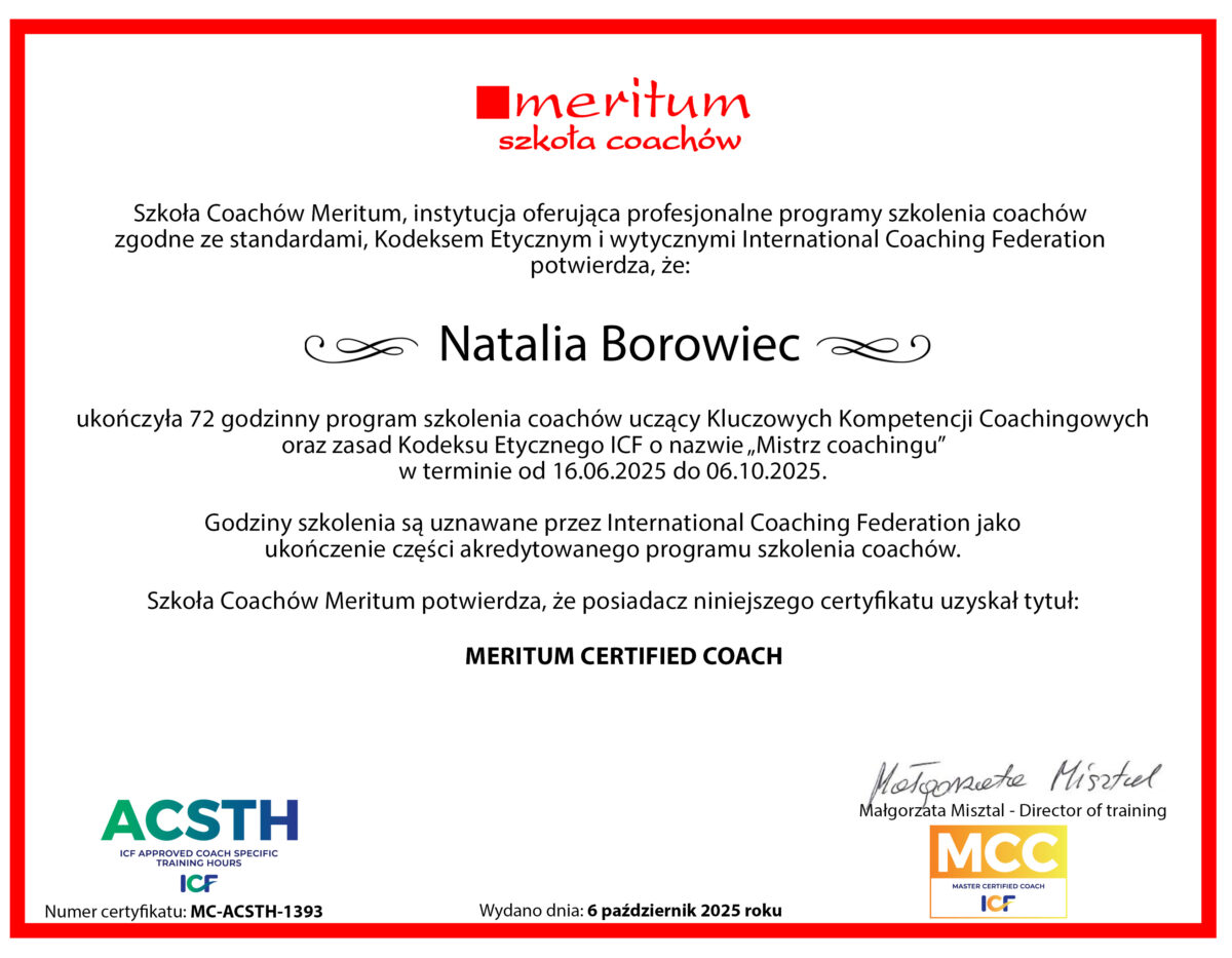 📌 Ukończyłam 72 godziny szkolenia coachingowego w Szkole Coachów Meritum oraz wielogodzinną praktykę w zakresie coachingu indywidualnego