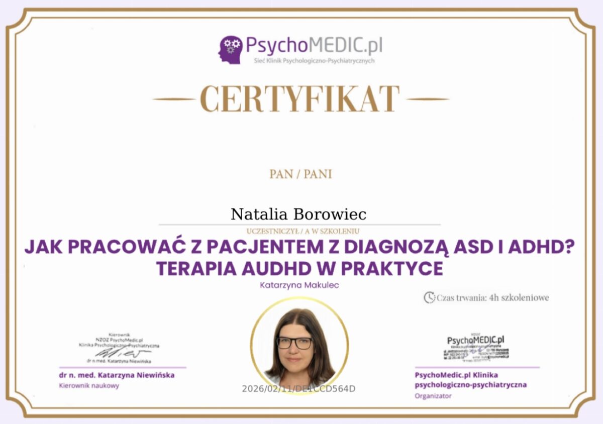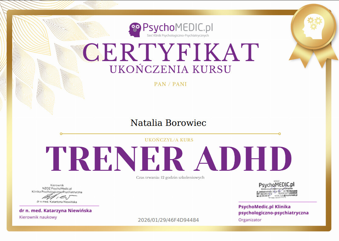 📌 Obecnie kształcę się nieustannie w kierunku coachingu osób z ADHD, by podwyższać swoje kwalifikacje, umiejętności oraz efektywność w pracy z klientami